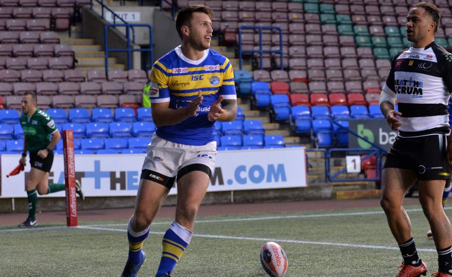 The home side were given a chance to hit back from the re-start when Adam Cuthbertson lost the ball in contact and they made the possession count when second row Matt Whitley finished off a flowing move. The conversion attempt was missed by Tom Gilmore. Leeds managed to increase the lead two minutes before half time when Myler slotted over a drop goal to give his side an 11-4 advantage. It could have been even better for Leeds following a brilliant break by Mikolaj Oledzki from the restart, supported by Walker.