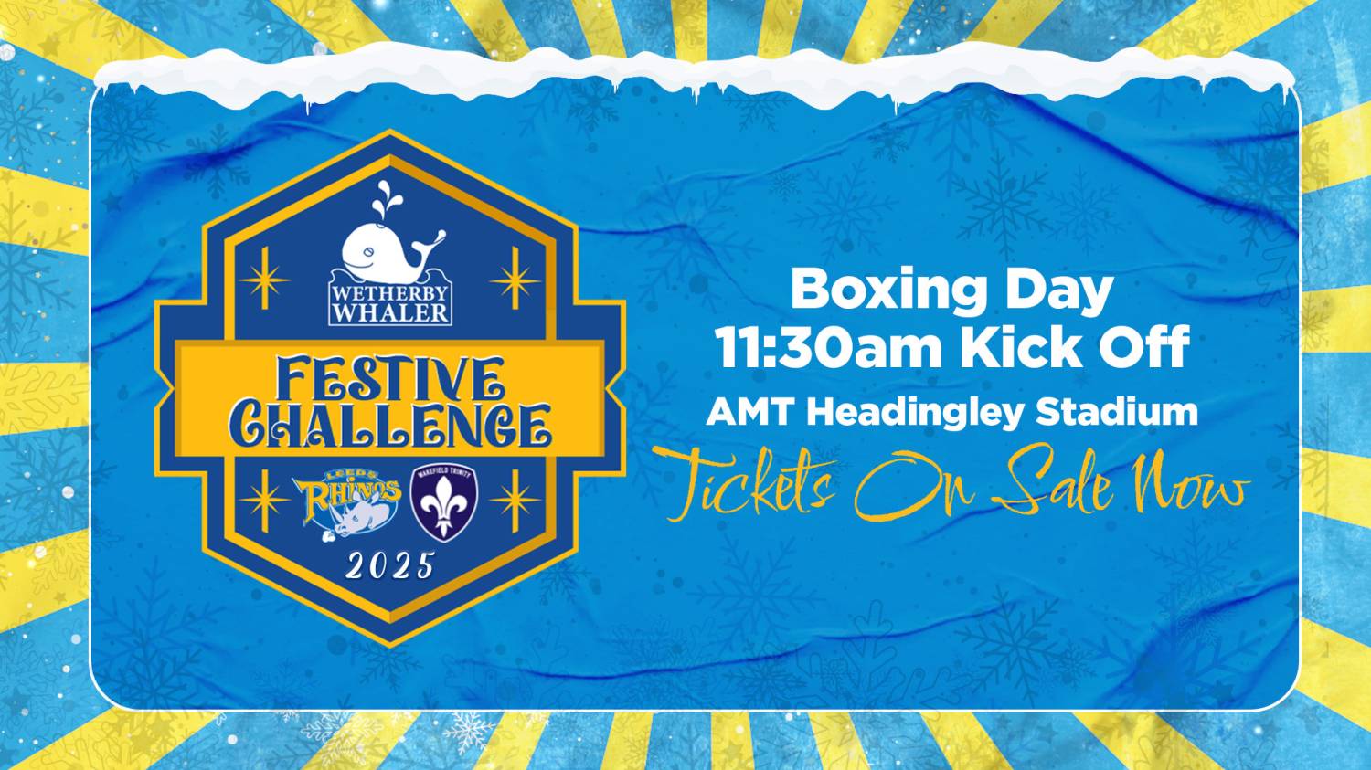 Boxing Day rugby is back! Join us at AMT Headingley Stadium on Friday 26th December as the Leeds Rhinos host Wakefield Trinity in the annual Wetherby Whaler Festive Challenge, kick-off 11:30am.